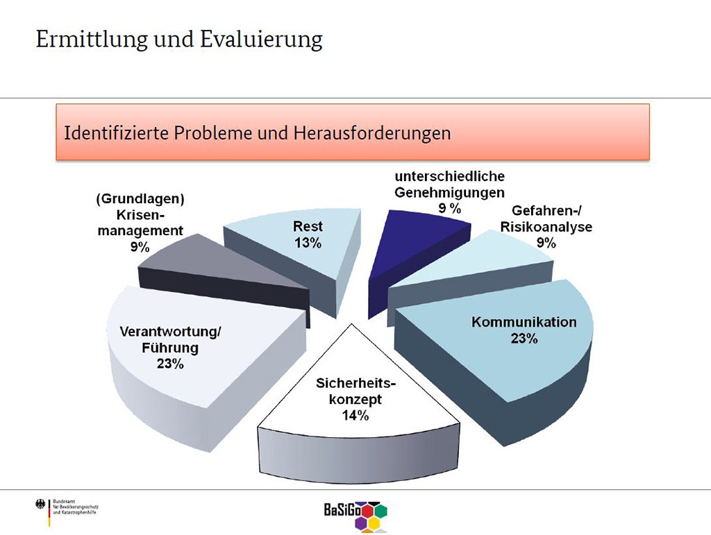 Auf der Abschlussveranstaltung des BaSiGo präsentierte Peter Wilde vom Bundesamt für Bevölkerungsschutz und Katastrophenhilfe (BBK) das Arbeitspaket 9, das eben diese verbesserte Ausbildung aller Beteiligten einer Veranstaltung vorsieht, um so die Sicherheit bei Großveranstaltungen langfristig zu erhöhen.