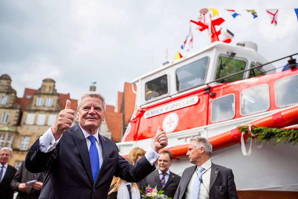 Bundespräsident Joachim Gauck besuchte als Schirmherr der Seenotretter die Jubiläumsveranstaltung auf dem Bremer Marktplatz (Bild: Ulf Duda / Pommerel )