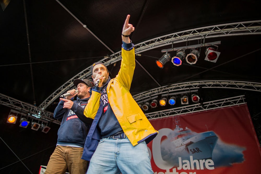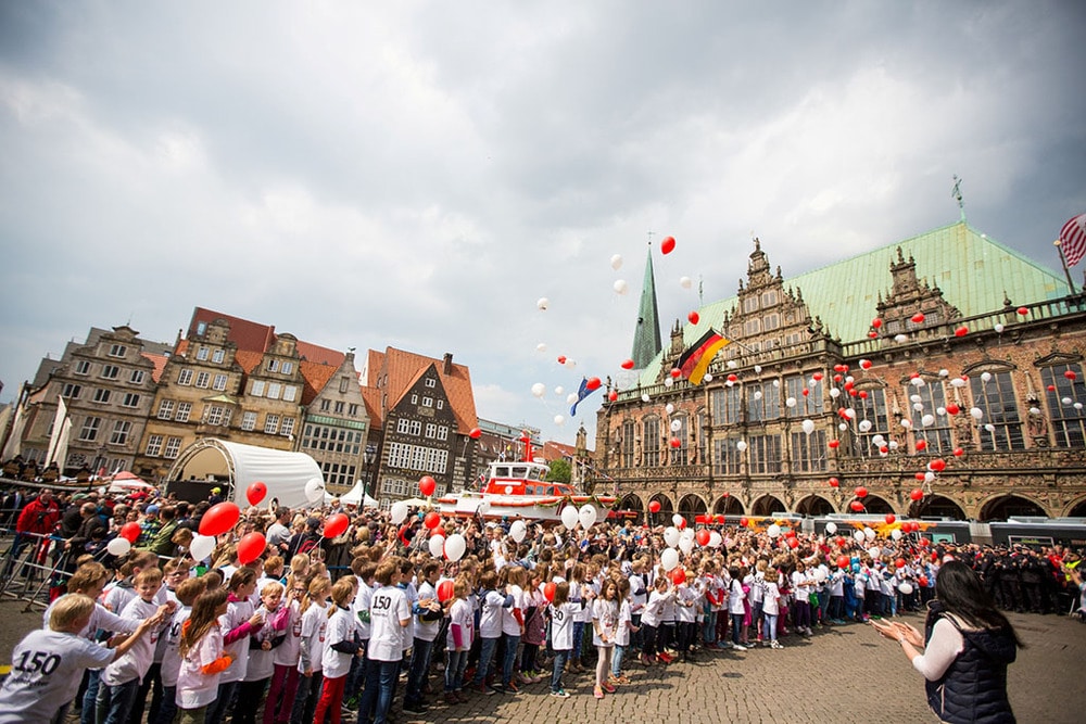 Zum Event auf dem Bremer Marktplatz mit hochrangigen Gästen, wie dem Schirmherrn der Seenotretter Bundespräsident Joachim Gauck, kamen rund 3.000 Besucher. Auch im Fokus des Bühnenprogramms standen die Retter und ihre Einsätze. Eine Schiffstaufe an Land, Musik-Performances, Interviews und Filmeinspielungen brachten das Thema abwechslungsreich und emotional auf den Punkt. Gleichzeitig sammelte der „rasende Reporter“ Aljoscha Höhn Glückwünsche und Statements von Passanten zu den Seenotrettern, die zu einem kurzweiligen Film zusammengeschnitten und über eine XXL-Outdoor-LED-Leinwand ausgestrahlt wurden.