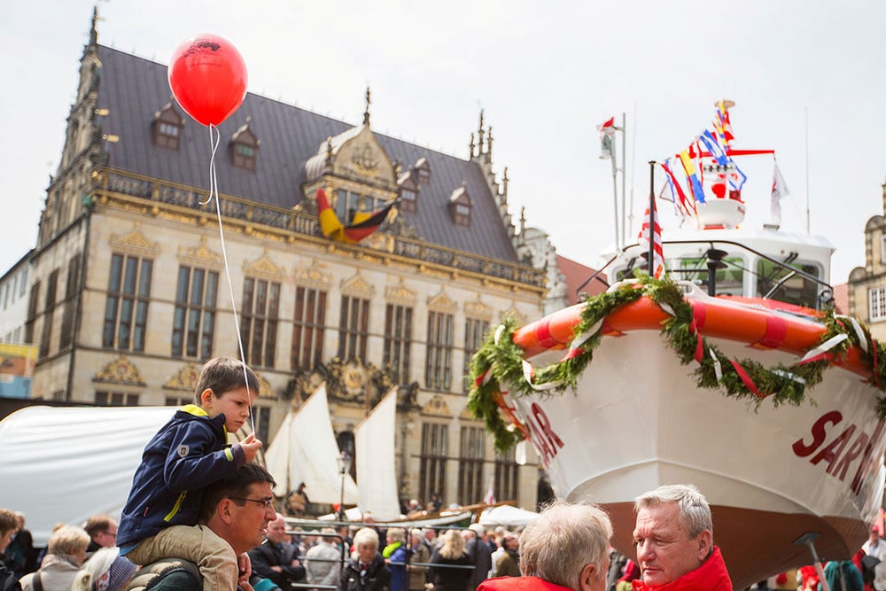 Schiffstaufe an Land: Für das Event ging ein Seenotrettungsboot auf dem Bremer Marktplatz vor Anker. (Bild: Ulf Duda / Pommerel )