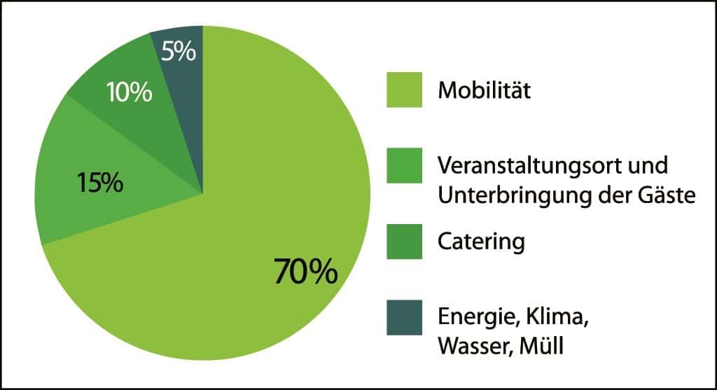 Wir müssen nicht drumherum reden: Veranstaltungen sind grundsätzlich eine Belastung für die Umwelt. Und zwar vor allem dann, wenn sie mit Reisen verbunden sind. Denn mehr als zwei Drittel aller CO2-Emissionen einer typischen Veranstaltung gehen auf das Konto der An- und Abreise (und Transfers). Nicht die Veranstaltung selbst, sondern die Teilnehmermobilität ist also der wichtigste Emissionstreiber! Erst dann folgen Location und Übernachtungsstätte, Speisen und Getränke und schließlich Energie- und Wasserverbrauch sowie Abfall.