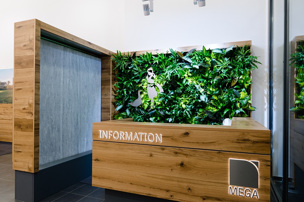 Fast augenzwinkernd treten klassische Formen der Repräsentation in den Hintergrund, der Fokus liegt auf den natürlichen Elementen. Für den Kunden wird MEGA so, über den reinen Zweck seines Besuches hinaus, als nachhaltig orientiertes Unternehmen erlebbar.