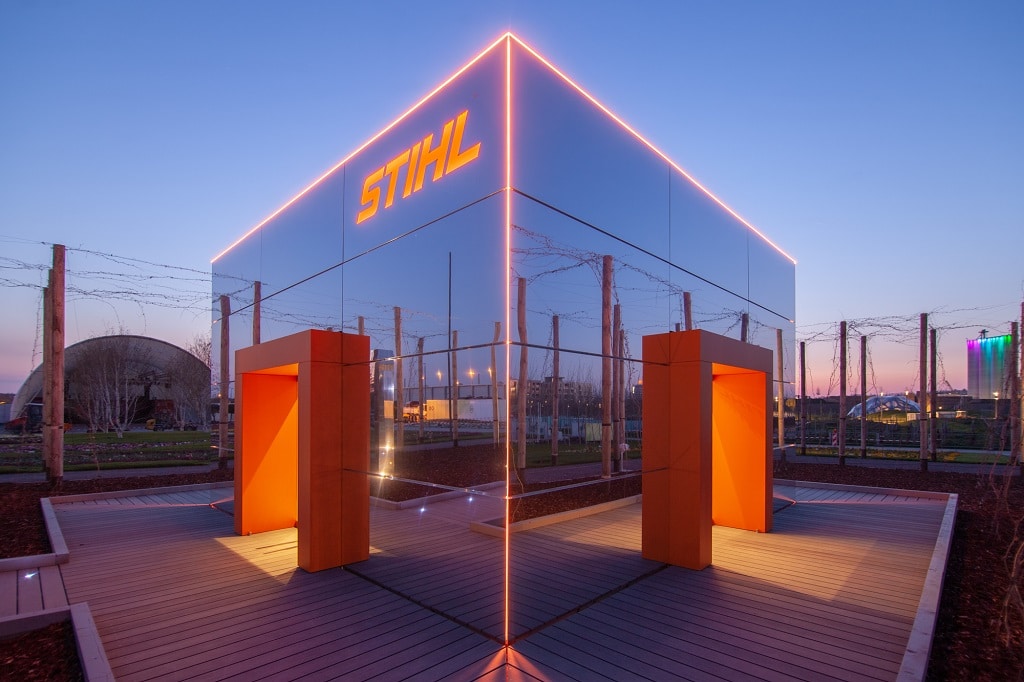 In der Tat sollte sich der Stihl Pavillon absolut in die Natur integrieren, so wie es die Stihl Produkte auch tun und quasi hinter den Kulissen agieren. Dazu wurde ein 196 Kubikmeter großer Kubus gebaut, dessen Außenfassade mit einer Fläche von insgesamt 112 m2 Spiegeln beeindruckte. Eingerahmt von Spiegelstelen, die wie Bäume in den Himmel ragten. So hatten die Besucher das Gefühl, durch einen Wald in einen Garten zu gelangen. Ein Symbol für den Weg der Marke Stihl, deren Wurzeln ursprünglich in der Forstarbeit liegen und die seit Jahren auch in privaten Gärten zu Hause ist.
