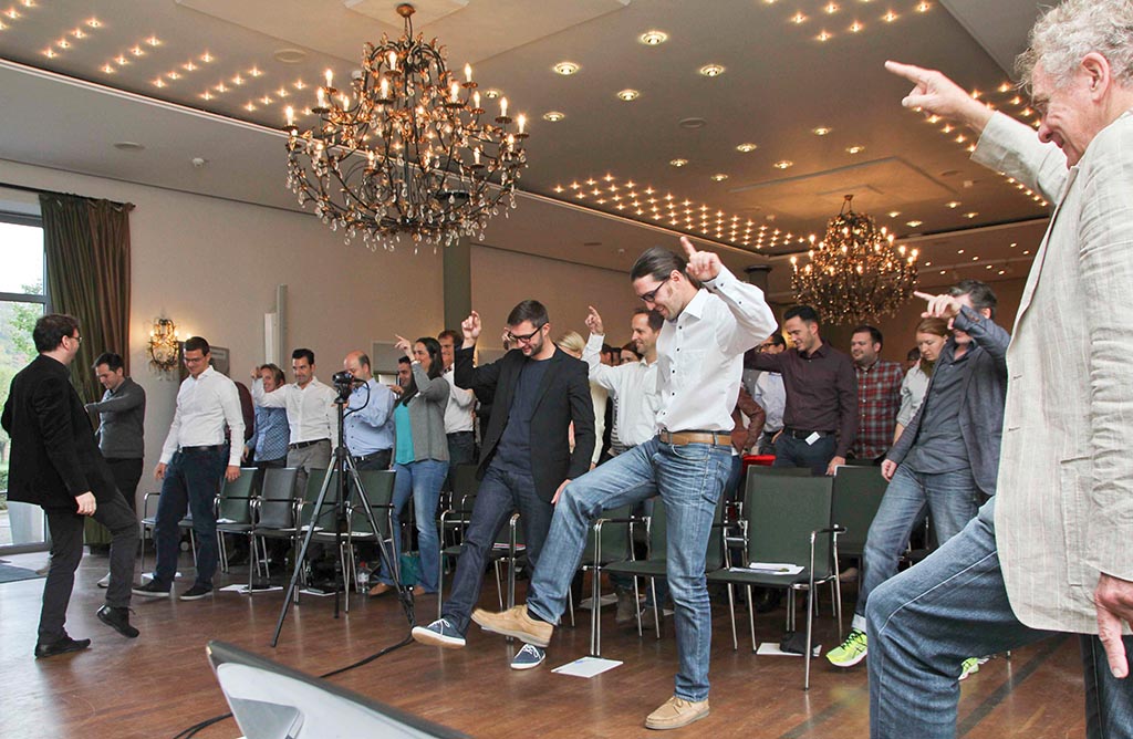 Zum Auftakt spannt Lorenz Hippe vom „Theater direkt“ den Bogen von der gemeinsamen Erfahrung an der Feuerstelle zur Situation im Hier und Jetzt: Jeder Teilnehmer kennt bereits seine schwierige Aufgabe, eine dreiminütige Rede zu halten, die von den Kollegen bewertet wird. Der erfahrene Theatermann macht klar, wie wichtig die Überwindung von Angst bei der Erschaffung von Neuem und Ungewohntem ist. Dazu wird die Geschichte von der Feuerstelle noch einmal vorgetragen. Die Teilnehmer bringen per Numeo-App ihre Gedanken dazu ein. Die Ergebnisse dieses Instant Brainstormings erscheinen anschließend auf der Leinwand.