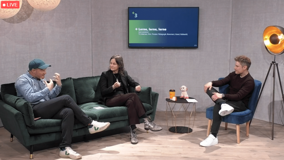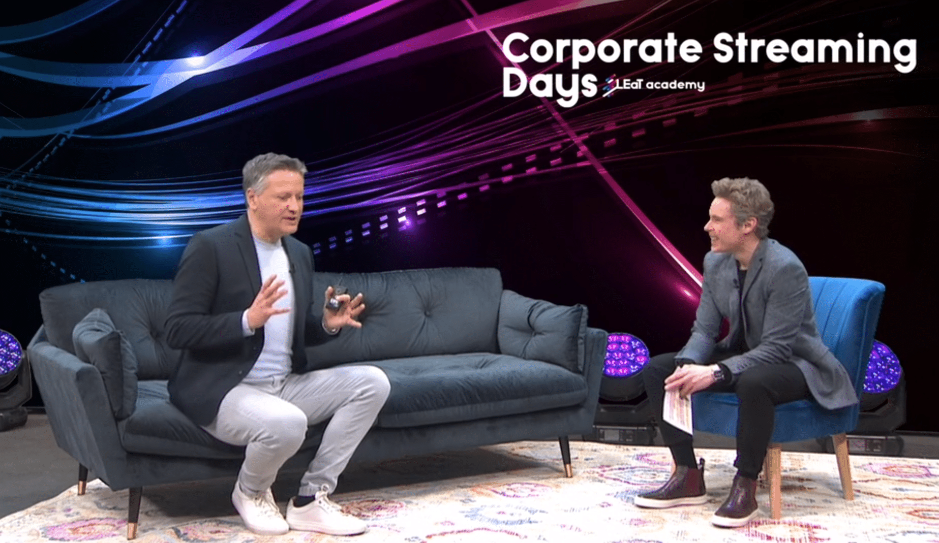 Chris Cuhls und Petra Lammers eröffneten auf der Couch die Corporate Streaming Days 2: Content Edition zum Schwerpunkt Storytelling für Digital-Events. (Bild: müllermusic Veranstaltungstechnik)