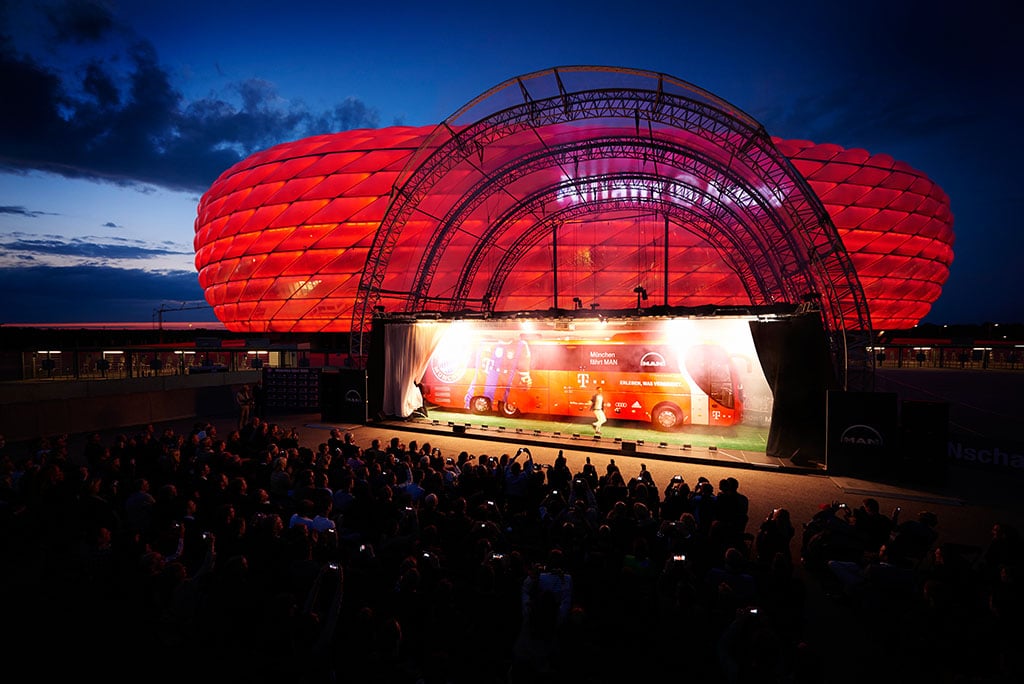 Vorstellung des neuen Mannschaftsbusses des FC Bayern München, auf einer überdachten Glasklar-Bühne. (Bild: Christian Kaufmann/Megaforce)
