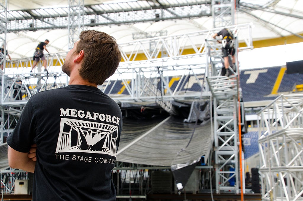 Im Umgang mit „großen Namen“ ist das Megaforce-Team erfahren, und die bewährten Bühnen werden selbst hohen Ansprüchen internationaler Topstars gerecht. Robin Langner weist darauf hin, dass von Megaforce selbstverständlich gerne auch überschaubare Vorhaben ausgestattet werden: „Niemand muss sich scheuen, uns wegen eines Stadtfestes mit einer 11 × 9-Bühne anzusprechen“, sagt der Key-Account-Manager, der als Produktions- oder Projektleiter gelegentlich „hands on“ auf der Baustelle anzutreffen ist. Zu den wichtigsten Kunden im Sportbereich zählt Red Bull: Megaforce wird regelmäßig über mehrere Wochen hinweg für spektakuläre Veranstaltungen wie die X-Games, X-Fighters und Munich Mash verpflichtet. Bei den X-Games wurden von Megaforce schon bis zu 90 (!) unterschiedliche Bauwerke im Münchner Olympiapark errichtet.