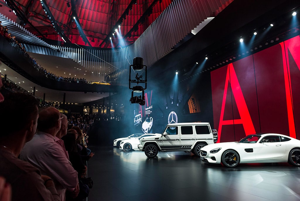 Wir entwickeln die Bühne in Abstimmung mit den Architekten und der Presseagentur, damit sie auch für die Presseaktivitäten genutzt werden kann. Von Mercedes gibt es Vorgaben, die neuesten Technologien und Fahrzeugreihen vorzustellen und diese prominent ins Licht zu rücken. Kommunikation im Raum ist insgesamt strategischer geworden und so haben auch unsere Show-Module eine direkte Kopplung an Kampagnen und an das, was die PR-Agentur macht. Das sind nicht wirklich freie Aufsätze, die wir schreiben. Es gibt aber immer Momente, die wir im Sinne der Marke neu gestalten können.