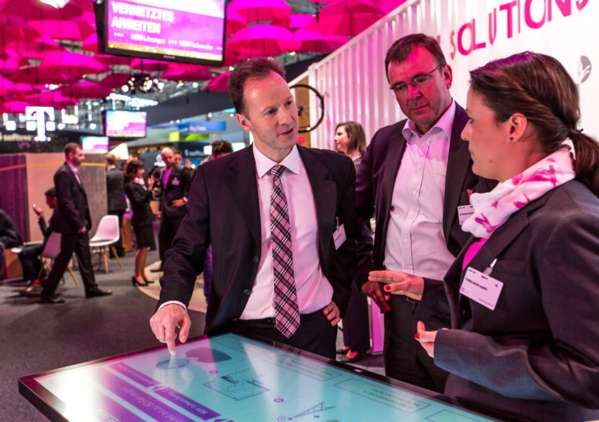 Berater im Kundengespräch am Stand der Telekom auf der CeBIT 2014. (Bild: Telekom )