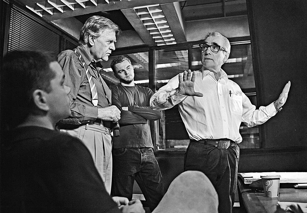 Szene aus “Departed”: Martin Scorsese gibt Instruktionen an Matt Damon, Michael Ballhaus und Leonardo di Caprio. Mit “Departed” gewann Scorsese erstmalig den Oscar für den besten Film und die beste Regie.