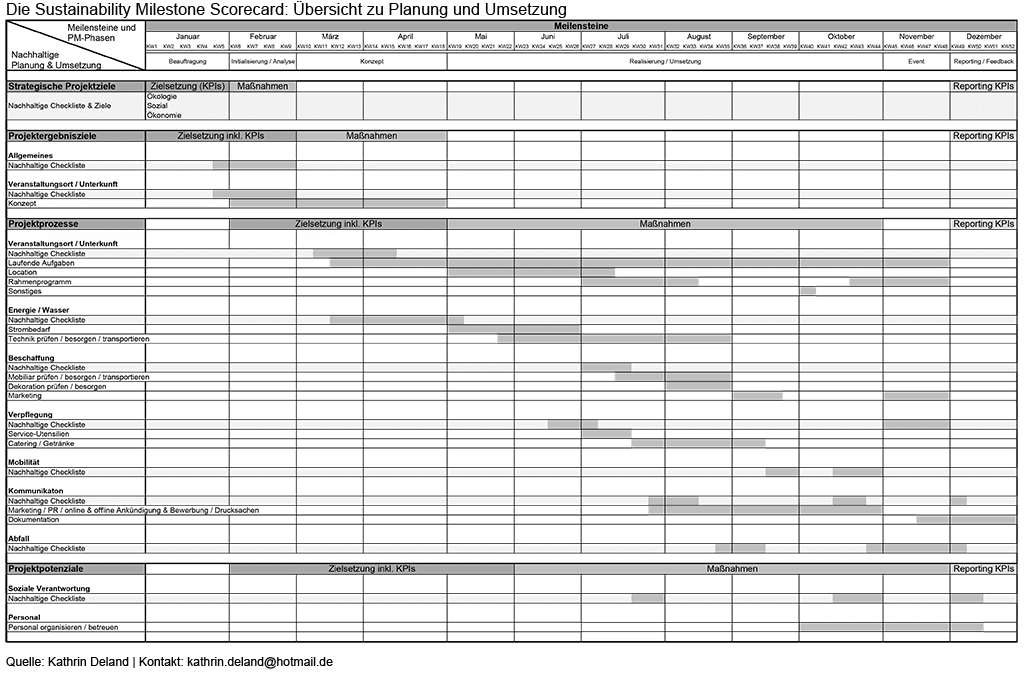 Das von Kathrin Deland neu konzipierte, integrierte und kombinierte Tool wird als „Sustainability Milestone Scorecard“ (SMSC) bezeichnet und muss in weiterführenden Studien empirisch getestet und validiert werden. Die SMSC kombiniert und ersetzt eigenständige Funktionen, Methoden und Checklisten. Ohne sie müssten Methoden oder Checklisten einzeln für ein Event aufgesetzt und aufeinander angepasst werden. Die SMSC umfasst alle Funktionen, Methoden, Checklisten und die ökonomische, ökologische sowie soziale Nachhaltigkeitsdimension in einer Scorecard, die für das Projektmanagement eines nachhaltigen Events benötigt werden. Durch den Einsatz der SMSC und deren umfassende Anwendungsmöglichkeiten lässt sich nicht nur nachhaltiges Projektmanagement von „Green Events“ verwirklichen. Vielmehr kann die SMSC auch aus ökonomischer Sicht einen Vorteil für Marktakteure bedeuten. Bei erweiterter empirischer Untersuchung muss festgestellt werden, ob durch das strukturierte Vorgehen anhand der SMSC Zeit- und Kosteneinsparungen sowohl vor, während als auch nach einem Projekt vermerkt werden können. Dadurch könnte der Umsatz innerhalb der Veranstaltungsbranche wiederum erhöht werden. Markenevents sind ein beachtlicher globaler Wirtschaftsfaktor, der weitreichende gesamtwirtschaftliche Effekte auch zu anderen Wirtschaftsbereichen erzielt. Die bedeutsamen Effekte zu weiteren Bereichen verleihen der Live-Kommunikation einen großen Einfluss. Dementsprechend kann die Branche auf andere Märkte einwirken und diese positiv beeinflussen, hin zu nachhaltigerem Wirtschaften und sozialem Engagement. Somit agiert und fungiert die Eventbranche letztlich als Vorbild, welche mit gutem Beispiel im Sinne der Nachhaltigkeit voranschreitet.