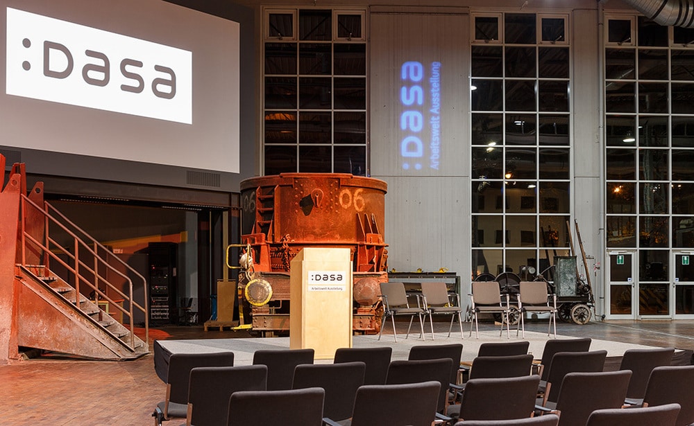 die Bundesanstalt für Arbeitsschutz und Arbeitsmedizin eine solche DASA genannt, auf 13.000 m² sinnlich wie handfest eingerichtet. Jahr für Jahr erleben mehr als 180.000 Besucher auf den zwei Etagen und in zwölf Stationen die Geschichte, Gegenwart und Zukunft der Arbeit. Weil sich die immer wieder ändert, ist die letztere Abteilung gerade noch in Überarbeitung. Die Ausstellungsräumlichkeiten sind übrigens als Eventlocation mietbar. In der Elektrikhalle oder Stahlhalle z. B. lässt sich in entsprechender Atmosphäre feiern und tagen. Eventmanagerin Kerstin Duschatz kümmert sich um solche Wünsche. Dr. Bernd Holtwick ist der Leiter der Ausstellungen. Passenderweise hat die DASA Arbeitswelt Ausstellung übrigens gerade einen Preis als bester Arbeitgeber für Volontäre gewonnen.