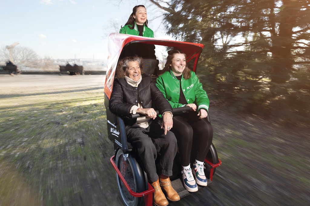 Mitra Kassai – hier selbst am Lenker – bringt die „Ollen“ mit dem „R`oll on Rikscha“-Service auf Touren. (Bild: Jonas Krantz)