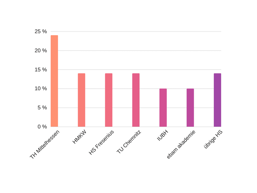 Auch dies ist eine Frage, die sich junge Menschen oftmals stellen. Welche Hochschule hat den besten Ruf und bietet die beste Grundlage für eine erfolgreiche Zukunft? Von verschiedenen Vorschlägen, die wir gemacht haben, konnte die Technische Hochschule Mittelhessen mit 23,8% die meisten Stimmen für sich verbuchen. Mit je 14,3 % folgen auf Platz 2 die HMKW Hochschule für Medien, Kommunikation und Wirtschaft, die Hochschule Fresenius sowie die TU Chemnitz. Mit knapp 10% der Stimmen teilen sich die accadis Hochschule Bad Homburg, die ebam akademie sowie die IUBH Internationale Hochschule den dritten Platz.