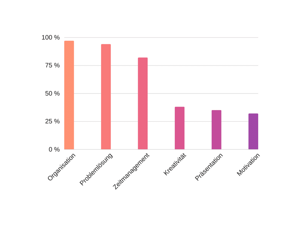 Liest man sich aktuelle Jobangebote durch, hat man oftmals den Eindruck, dass sogar für Trainee-Stellen niemand Geringeres als Stephen Hawking persönlich gesucht wird. Dennoch gibt es auf jedem Themengebiet einige Punkte, mit denen man seinen Mitbewerbern einen Schritt voraus ist. Im Hinblick auf die methodischen Kompetenzen steht für Eventagenturen eine gute Selbstorganisation an oberster Stelle. Ganze 97% unserer befragten Teilnehmer haben hier ihren Haken gesetzt – dicht gefolgt von Methoden zur Problemlösung (94 %) und einem guten Zeitmanagement (82 %). Mit etwas größerem Abstand folgen die Kreativitätstechniken und Präsentationstechniken. Kein Wunder, müssen sich Agenturen doch regelmäßig vor Kunden und in Pitches beweisen. Das Schlusslicht unserer Umfrage sind die Motivationstechniken, die aber – zugegebenermaßen – in einer mitarbeiterfreundlichen und vorausschauenden Agentur eher unnötig sind.