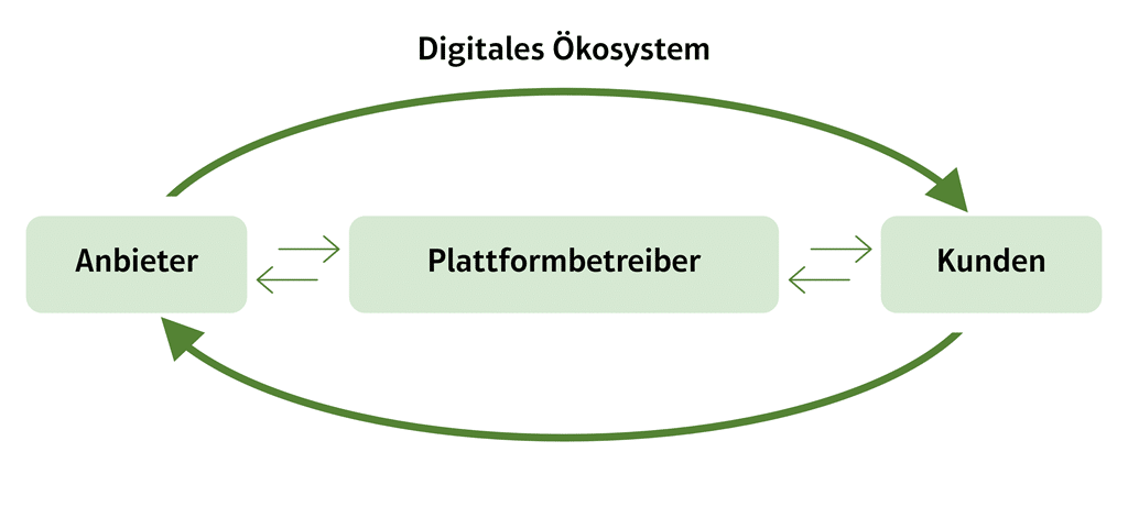 Damit das Plattformkonzept am Markt erfolgreich ist, ist die Gewinnung der Akteure (Anbieter) der zentrale Erfolgsfaktor. Das heißt: Es geht um wirtschaftliche Interessen, es gibt mehrseitige Märkte, es werden Geschäftsbeziehungen zwischen den verschiedenen Teilnehmerseiten des digitalen Ökosystems geschaffen, wobei die Transaktionen über eine digitale Plattform ausgeführt werden.
