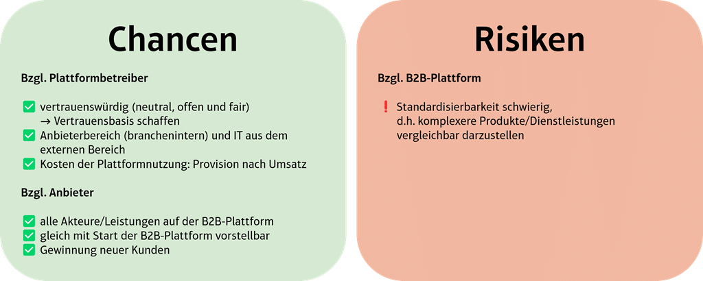B2B-Plattform: Obwohl gleiche Präsentationsstandards von Angeboten von allen als positiv angesehen werden und den Wettbewerbsvergleich ermöglichten, bleibt für die Mehrheit der Anbieter die Standardisierbarkeit schwierig, d.h. komplexere Produkte/Dienstleistungen vergleichbar darzustellen, da dies (noch) nicht vorstellbar sei. Da es für Anbieter von Dienstleistungen im Eventbereich schwerer werde, ihr Leistungsangebot plausibel darzustellen, könne keine Standardisierbarkeit eine große Hürde darstellen, an der digitalen B2B-Plattform teilzunehmen.