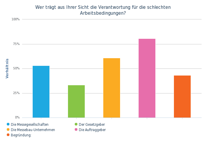 Geht es darum festzustellen, wer die Verantwortung für die schlechten Arbeitsbedingungen im Messebau trägt, sind sich 80,4 % der Befragten einig, dass diese bei den Auftraggebern liegt. Für weitere 60,8 % der Umfrageteilnehmer tragen auch die Messebau-Unternehmen eine Verantwortung. Immerhin 52,9 % der Befragten machen die Messegesellschaften mitverantwortlich für die Arbeitsbedingungen im Messebau und 33,3 % sind der Meinung, dass auch der Gesetzgeber eine Verantwortung für die aktuelle Situation trägt.