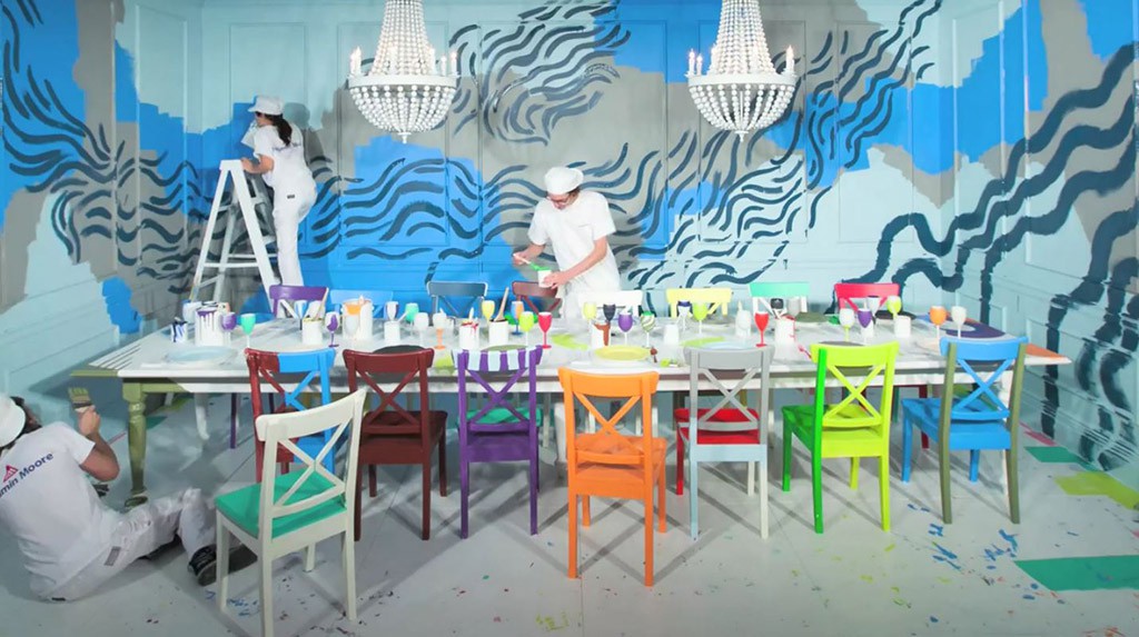Weiße Wände, weißer Tisch, weiße Stühle, Tische und Kronleuchter nebst Tellern und Gläsern – soweit die Ausgangssituation. Mit dieser Grundlage startete das Kreativteam von David Stark seine Kreation ohne Plan, wie der Raum am Ende aussehen sollte. Ausschweifende Farbnutzung sorgte für zahlreiche Gestaltungen, die definitiv im Gedächtnis bleiben.
