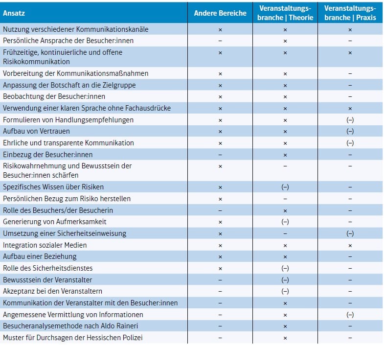 Für die Besuchersicherheit und ein positives Veranstaltungserlebnis ist eine erfolgreiche Sicherheitskommunikation in Form von Risiko- und Krisenkommunikation entscheidend. Die Kommunikationsmaßnahmen, die in den beschriebenen Szenarien angewendet wurden, sind Teil der Krisenkommunikation. Sie werden grundsätzlich vorab in einem Sicherheitskonzept festgelegt. Voraussetzung für eine erfolgreiche Krisenkommunikation ist eine erfolgreiche Risikokommunikation. Zugehörige Maßnahmen lassen sich jedoch meist nur schwierig herausstellen und benennen.
