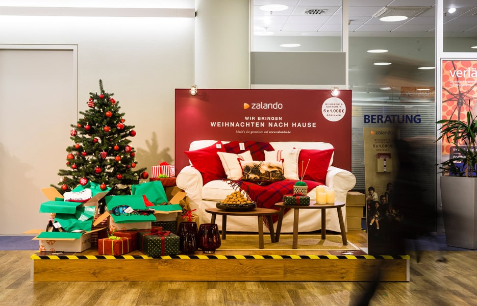 Von November bis Dezember 2013 setzte Schrenk + Schrenk Zalando mit der Kampagne „Wir bringen Weihnachten nach Hause. Mach’s dir gemütlich auf www.zalando.de“ in Szene. „Stressfreie Feiertage statt Geschenkestress“ war der konzeptionelle Startpunkt, in dessen Sinne die Berliner Agentur eine Roadshow konzipierte und umsetzte. In Kooperation mit der Postbank wurde in 20 Filialen ein Wohnzimmer eingerichtet – so wie bei einer deutschen Familie unterm Christbaum. Integraler Bestandteil der Architektur waren neben der Wohnzimmerausstattung und dem Christbaum auch Brandingflächen, Packaging und saisonal erhältliche Produkte. Die integrierte Kampagne schlug die Brücke zwischen online und offline und überzeugte nicht nur Digital Natives von den Vorteilen des funktionalen E-Shops.
