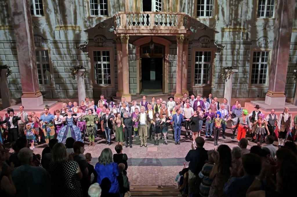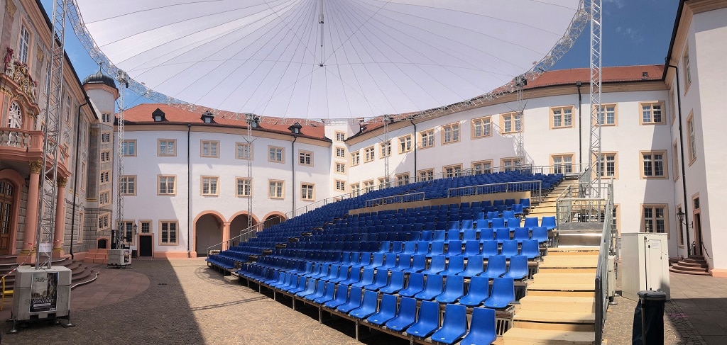 Auch Christian Held, technischer Leiter der Festspiele, ist von der Skyliner-Lösung begeistert: „Die Neugestaltung des Zuschauerbereichs ist ein sehr wichtiger Punkt, weil diese unmittelbar mit der künstlerischen Konzeption der Festspiele einhergeht. Denn die im Trompe-l’œil-Stil bemalte Schlossfassade des Südflügels ist gleichzeitig das Hauptelement aller Bühnenbilder und sollte somit wieder gänzlich zu sehen sein. So bestand meine Aufgabe darin, eine Eventüberdachung zu finden, die es ermöglicht, den freien Blick auf die Fassade zu gewähren. Die besonderen Vorzüge des Skyliner-Daches liegen neben der hohen konstruktiven Stabilität mit der erstaunlichen und geprüften Auslegung bis zu Windstärken von 12 Beaufort in der filigranen und somit leicht wirkenden Traversen- und Spindelkonstruktion. Dass die Dachmembran über die äußeren Gurtrohre der Ringtraversen und nicht innerhalb des Traversenrings gespannt wird, verleiht der gesamten Konstruktion eine ästhetische Kompaktheit, die dazu beiträgt, dass in unserem Fall das Zusammenwirken des durch die enorme Höhe entstehenden ‚Luft-Raumes‘ ein Gefühl eines luftigen Auditoriums entstehen lässt, ähnlich einem Zuschauersaal in einem festen Theatergebäude.“