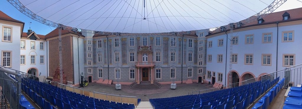 Neues Konzept, neues Programm und neues „Dach“ – damit konnte die neue Intendantin der „Schlossfestspiele“ im baden-württembergischen Ettlingen, Solveig Bauer, in diesem Jahr punkten. Seit 1979 zieht das Freiluft-Theaterfestival in jedem Sommer zehntausende Zuschauer in den Hof des barocken Schlosses. Schauspiel, Oper, Musical, Kinderstück, Zauberei – alles dabei zwischen Juni und August. In diesem Jahr etwa die unter Mitwirkung eines „Bürgerchors“ von der Intendantin als „Volksoper“ inszenierte „Zauberflöte“. Dabei wurde quasi aus den Schlossfenstern heraus gespielt. Die Einführung solcher experimenteller Formate brachte bei der Gestaltung des Zuschauerraumes eine Herausforderung mit sich: Die bisherige Konstruktion mit einem Tribünendach hätte die Sicht auf und zu den Fenstern teilweise verdeckt – und so wurde nach einer filigraneren „leichten“ Alternative für die Zuschauerbedachung gesucht.