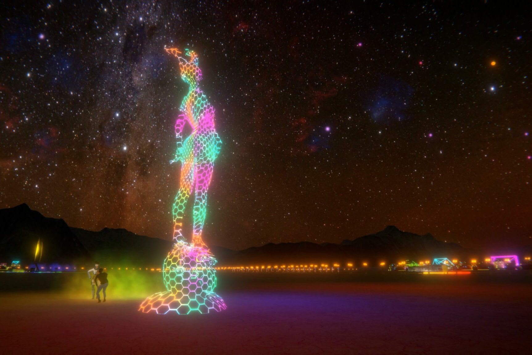 Getrieben durch die Pandemie fand das legendäre Burning Man Festival 2020 und 2021 nur virtuell statt. Ein großer und mutiger Schritt für die internationale Burner Community. Zum regulären Burning Man treffen sich jedes Jahr über 75.000 Menschen im US-Bundesstaat Nevada in der Black Rock Desert, ca. 150 km nord-nordöstlich von Reno. Das Ganze ist eine Mischung aus Kunstausstellung, Selbstdarstellung und Mega-Party. Diese drei Elemente wurden u.a. in der App AltspaceVR auf ein riesiges Areal übertragen. Es gab verschiedene Bühnen für Konzerte, Kunstausstellungen und natürlich endlos viele, digitale Installationen und Skulpturen. In seiner Gesamtheit wurde der typische Grundriss von Black Rock City übernommen. Wer hier in die Welt eintauchte, konnte sich treiben lassen, Menschen aus der ganzen Welt treffen, Kunst bewundern und ausgelassen feiern. Mit großem Erfolg. Die Entwickler:innen berichteten von begeisterten Burnern, die vor Glück in Tränen ausbrachen, weil sie dank Social VR ihre Community und ihr geliebtes Festival auf ganz neue Weise erleben konnten. Und zwar diesmal ohne den penetranten salzigen Sand in der Unterwäsche.