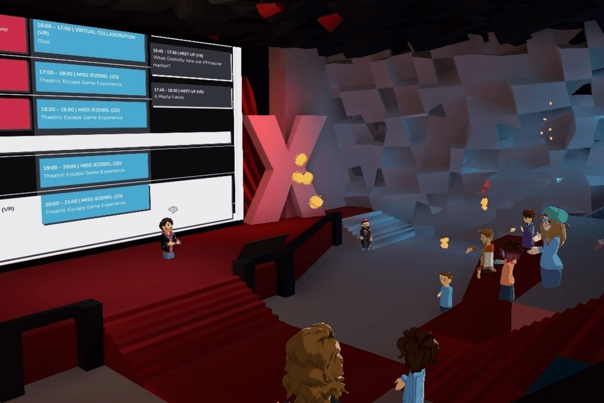 Hier gibt es einen Park mit Lagerfeuer zum Networking und zum Plaudern, eine Sport-Ecke mit Basketballplatz lockert auf, ein großes Auditorium, in dem Speaker Filme und Präsentationen zeigen können und – als Überraschung – im Underground einen Club mit durchsichtigem Dancefloor, auf dem zum Ausklang eine VR-DJane auflegt. Wie in einer realen Location finden unter den Teilnehmenden viele zufällige Begegnungen statt und das komplette Eintauchen in die Welt ermöglicht ein intensives Auseinandersetzen mit den Themen.