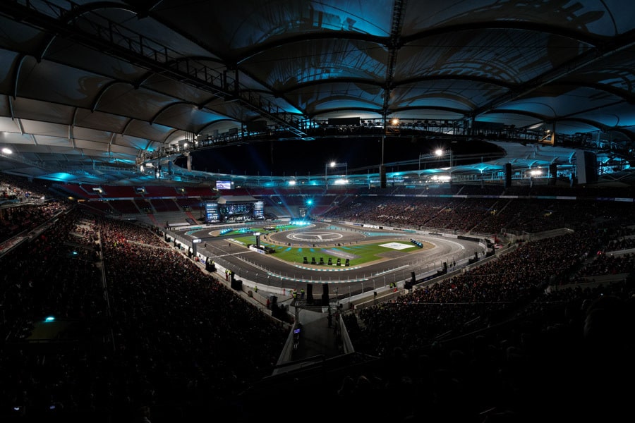 Für das Event “Stars & Cars” wurde der Rasen in der Stuttgarter Mercedes-Benz Arena eigens durch eine asphaltierte Rennstrecke ersetzt. (Bild: Jörg Küster)