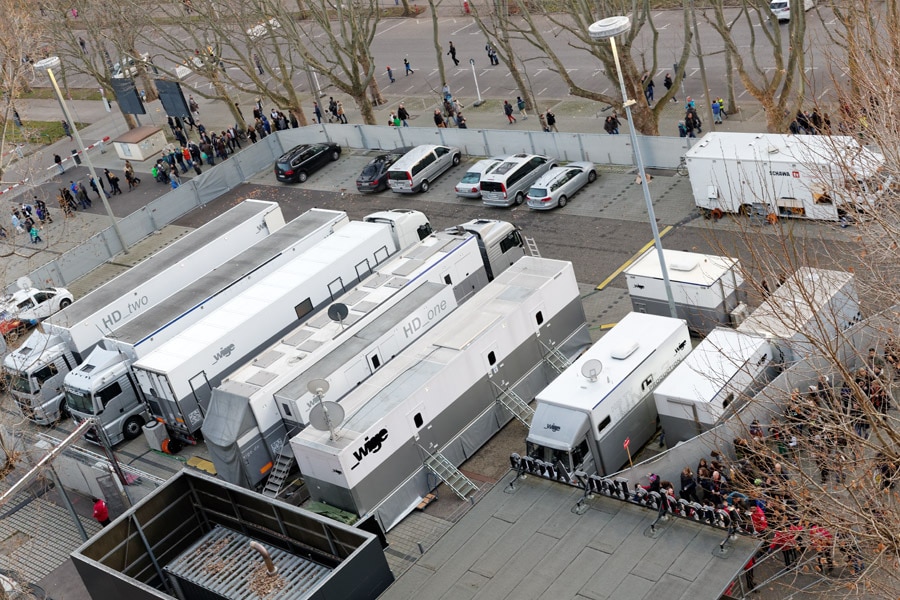 Die wige Solutions GmbH hatte unmittelbar neben dem Stadion einen Broadcast-Compound mit mehreren Übertragungs- und Rüstwagen aufgebaut. (Bild: Jörg Küster )