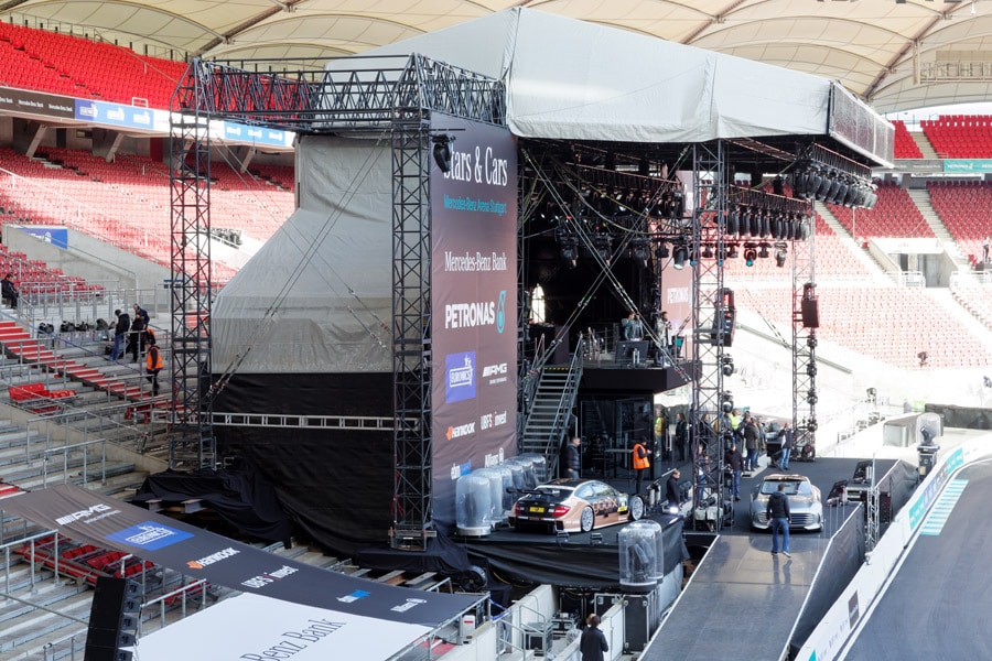 Für Aufbau und Betrieb der in der Cannstatter Kurve errichteten Hauptbühne samt der per Auto befahrbaren Rampen zeichnete die Stageco Deutschland GmbH verantwortlich. Drei Tages- und zwei Nachtschichten wurden von der Crew für die Errichtung des doppelgeschossigen Bauwerks benötigt. Eine Besonderheit war ein schwerer, von Jost Motorsport zur Verfügung gestellter Glascontainer mit einer Grundfläche von 6 × 5 Metern, der mittig in das Bühnenbild integriert und durch einen speziellen Unterbau gesichert werden musste. Der Container wurde mit einer Szenenfläche für die Showacts überbaut.
