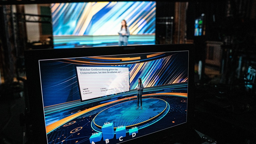 Gerade im Vergleich zu einer LED-Cave bzw. einem Greenscreen habe man beim Event vor Ort auch den Vorteil des „echten Hauses“, das idealerweise mit einer Steadycam begehbar und somit vorführbar sei und Setwechsel erlaube. Verschiedene Kulissen böten außerdem die gern genutzte Option, die Veranstaltung an einem gewissen Punkt aufzusplitten und das Publikum in Gruppen an den getrennten Sets weiter zu begleiten, führt Corinna Di Pietro weiter aus. „Wenn man nur den Schuss von vorne hat, braucht man eine wahnsinnige Breite im Raum, um abwechslungsreiche Kamerabilder zu erzeugen. Darum wählen unsere Kunden gerne einen Venue mit einer größeren Veranstaltungsfläche, in der verschiedene Einzelsets integriert werden können. Die Aufmerksamkeitsspanne ist damit leichter zu halten, wenn man in unterschiedliche Set-ups springen kann und nicht immer nur das eine Bild-Set-up anbietet.“