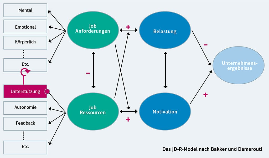Als theoretische Grundlage für die Datenerhebung, -strukturierung und -auswertung wurde das JD-R Model (Job-Demand-Resources Model) nach Bakker und Demerouti (2007) herangezogen, das im Folgenden als Arbeitsanforderungen-Arbeitsressourcen Modell eingeführt wird.