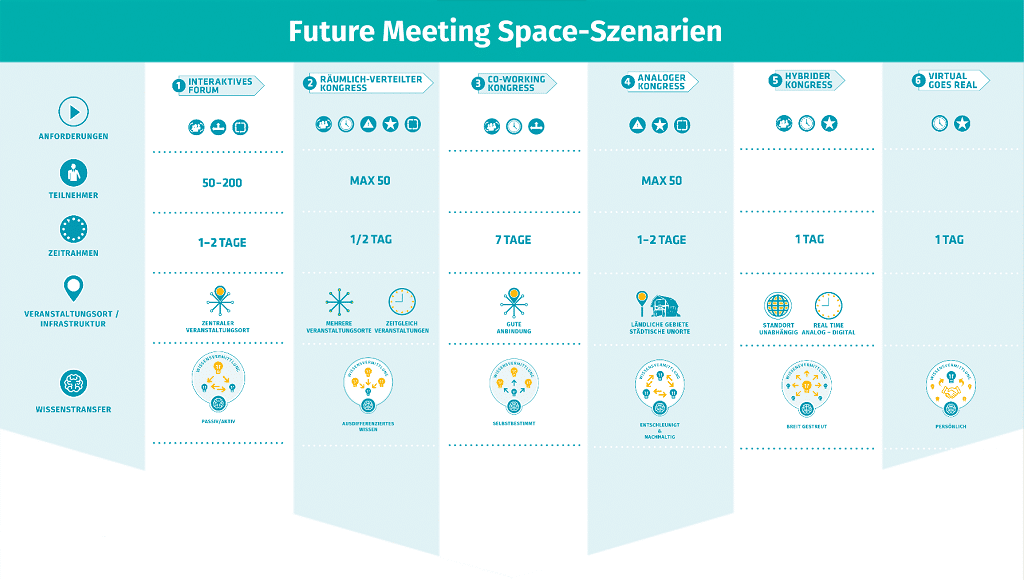 Denn glaubt man Matthias Schultze wird aus dem Homo eventus, dem sich seit Urzeiten zu rituellen, gemeinschaftlichen Versammlungen zusammentreffenden Veranstaltungsbesucher, in Zukunft ein Homo eventus digitalis. Die Digitalisierung wird das Zusammentreffen von Menschen, die Art wie Veranstaltungen durchgeführt werden, nachhaltig verändern. Damit die Branche nicht nur Schritt halten, sondern den Prozess maßgeblich mit beeinflussen kann, wurde der Innovationsverbund Future Meeting Space gegründet. Eine erste Projektphase untersuchte dabei die räumlichen und infrastrukturellen Anforderungen an Veranstaltungen und stellte neue Eventformate, sechs sogenannte „Future Meeting Szenarien“, vor.