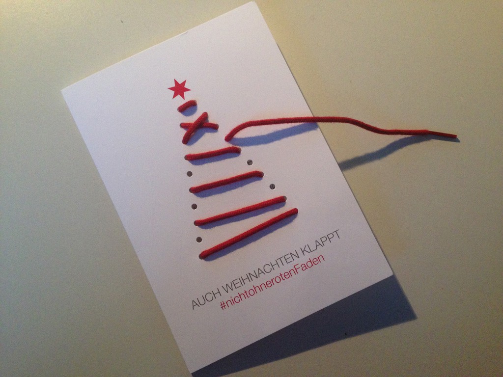 Die Agentur für Kommunikation aus Hamburg will die kreative Ader im vorweihnachtlichen Bastelfieber anregen und verschickt Karten, in denen man sich mit einem roten Faden den Weihnachtsbaum selbst zusammenknüpfen muss. Pro gepostetes Selfie unter #nichtohnerotenFaden gibt’s eine Spende von 5 Euro für die Hamburger Tafel.