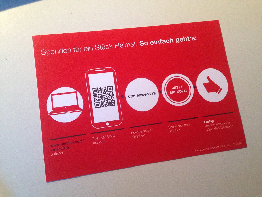 Spenden für ein Stück Heimat. Das ist das Motto der Kölner Agentur für Live-Communication verteilt per Postkarte Spendencodes. Pro Einlösung eines Codes geht eine Spende an die Organisation „Über den Tellerrand“, die durch Begegnungsangebote rund um das Thema Kochen eine Plattform für ein neues Miteinander zwischen Flüchtlingen und Beheimateten schaffen will. Dazu gibt’s einen schönen Kalender, in dem 13 Illustratoren aus der ganzen Welt ihre Vorstellung von „Heimat“ verwirklicht haben.