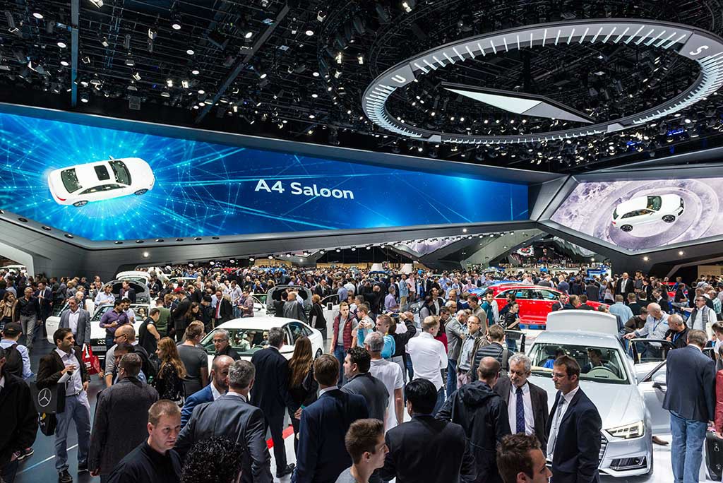 Insgesamt immer elaborierter wird der Umgang mit Medien, auch kleine und mittlere Stände überzeugen mit überraschenden Konzepten und Formaten. Zum Beispiel Alfa Romeo: Ein innen bespieltes Medienband umschließt über Kopf den kompletten Innenraum des Standes. Und wird kongenial bespielt. Mal vollflächig, mal in Teilen, mit Bildern, die zueinander in Bezug stehen und sich ergänzen. Und den Besucher zusammen mit der Audioscape wirklich in eine ganz eigene Welt entführen. Oder Opel: Eine Spiegeldecke verlängert die Medienbespielung fast ins Unendliche. Das passt, gefeiert wird die Premiere des neuen Astra. Und Jeep: Klug gestaffelte Medienflächen spielen miteinander, ergänzen sich, schaffen Tiefe oder übergreifende Bilder und erzeugen auch hier eine ganz eigene, markenkonforme Atmosphäre.