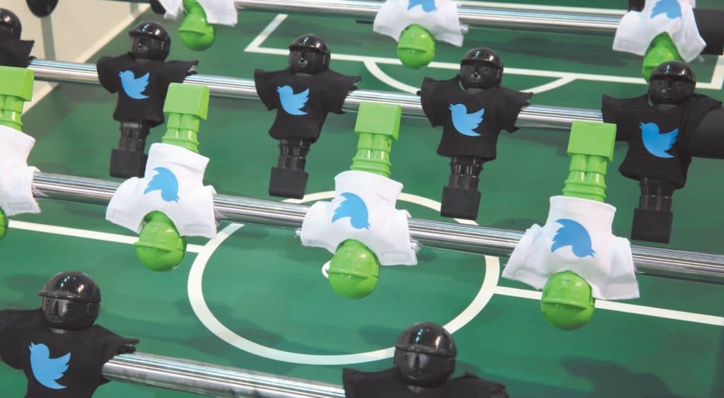 Die aufgereihten Kicker-Spielfiguren waren selbstverständlich mit Twitter-Leibchen versehen.