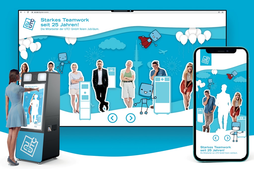 „Wir sind mit unserer Mannschaft quasi in allen Teilen der Welt unterwegs, realisieren rund 400 Projekte im Jahr – vor allem im B2B Bereich“, erklärt UTC-Geschäftsführer Jörg Spatzier. Dabei bietet das Unternehmen seinen Kunden wie Apple, Audi, Deutsche Telekom, Porsche, DekaBank, Lufthansa, Deutsche Bahn und Coca-Cola ein breites Portfolio von webbasierten Foto- und Video-Anwendungen. Besonders gefragt sind u.a. die Fotomodul-Systeme „AR Celebrity“ und „Digitale Menschenkette“.