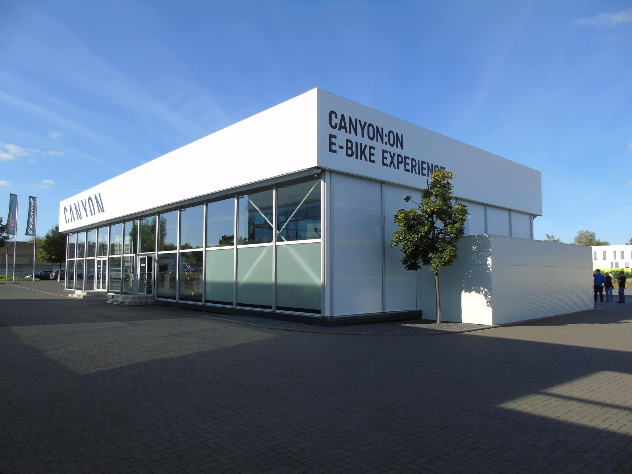 Auch Jan Brosterhues ist von „seinem“ repräsentativen und großzügigen Bau angetan: „Es hat ein Open-Air-Ambiente, gleichzeitig sind die Kunden aber vor Wind und Regen geschützt und können die Bikes so in Ruhe inspizieren. Vor allem der durchgehende Holzboden und die langgezogene Membran verleihen dem Ensemble den Eindruck eines geschlossenen Bauwerks, und doch hat der Kunde durch diese spezifische, offene Bauweise gleich einen guten Gesamtüberblick über die Angebotsvielfalt von Canyon.“