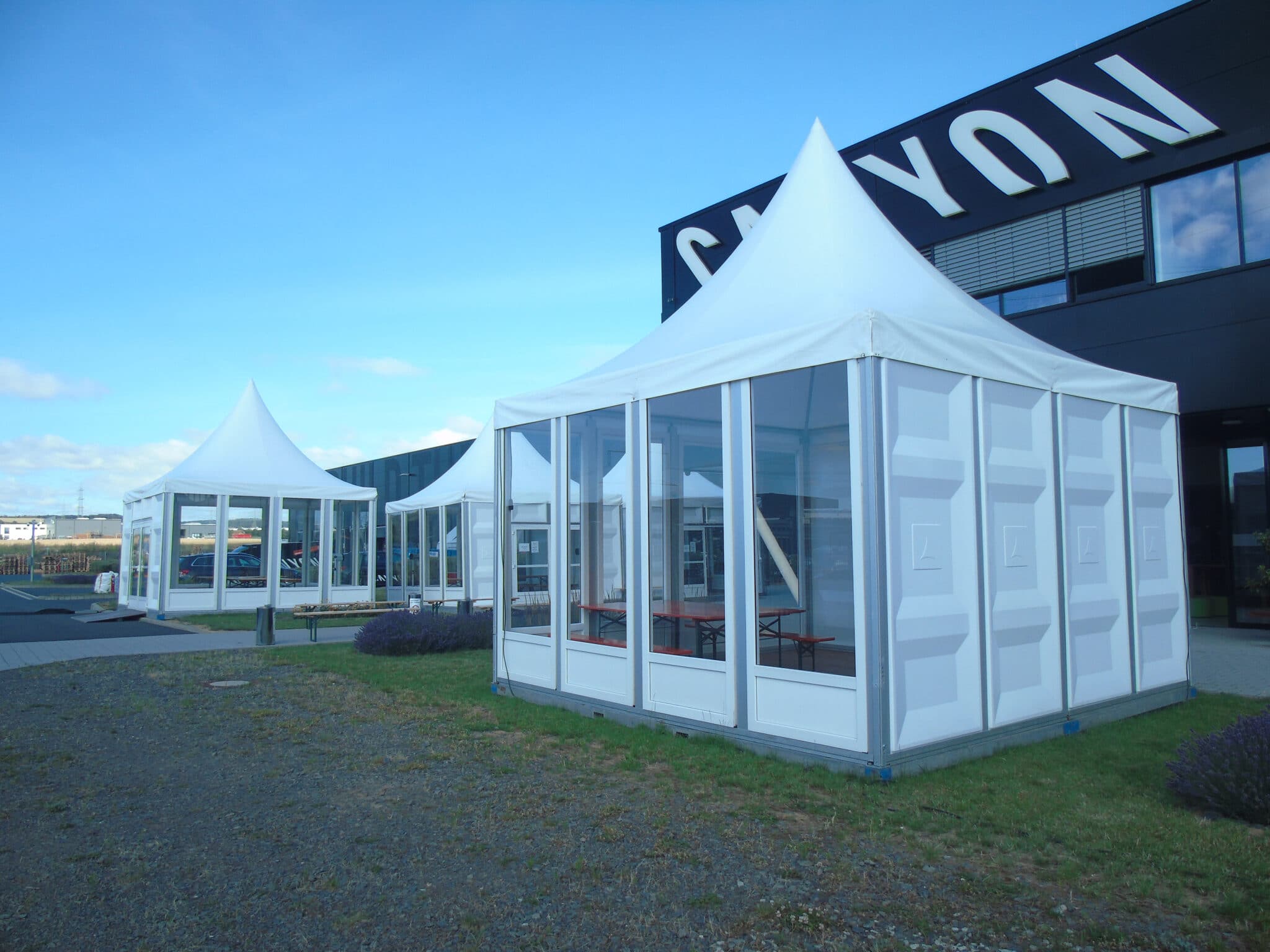 Kurze Zeit später wurden auch die Räumlichkeiten am Produktionsstandort von Canyon, ebenfalls in Koblenz, zu eng. Eine zusätzliche Möglichkeit, unter Corona-Bedingungen essen zu können, sollte entstehen. Auch hier konnte Tent Dimensions helfen. Die Lösung: der Aufbau von sieben einzelnen 5 x 5 Meter großen Pagoden mit genügend Platz, um in der neuen „Factory Mensa“ an Biertischen mit dem nötigen Abstand zueinander zu essen. Ebenso werden die klimatisierten temporären Bauten für Besprechungen sowie ein Zelt als Raucherlounge genutzt. Das Besondere an der Konstruktion: Aufgrund der stabilen Bodenbeschaffenheit, der festen Fassaden – teilweise aus Glas – sowie den wetterbeständigen Türen konnten die Pagoden auch den ganzen Winter hindurch von der Belegschaft genutzt werden.