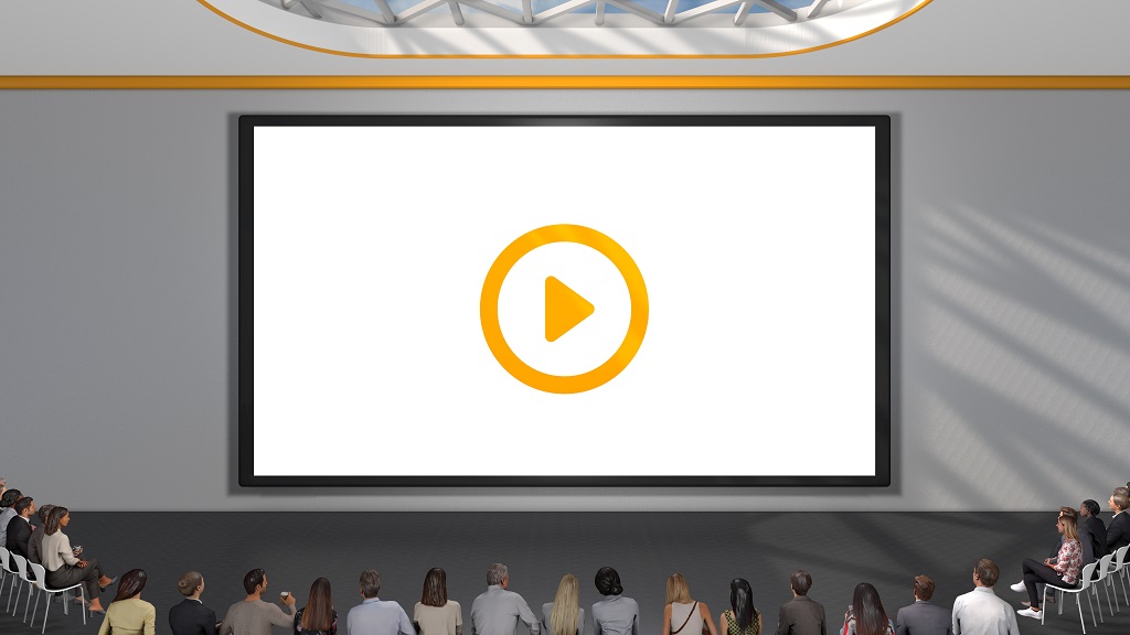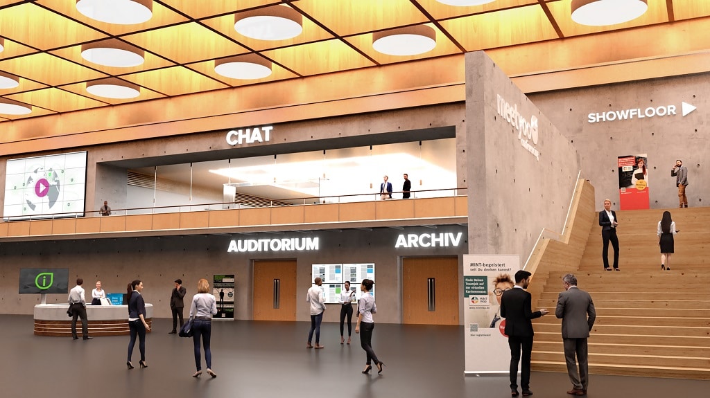 Virtuelle Messehalle und Auditorium mit Keynotes