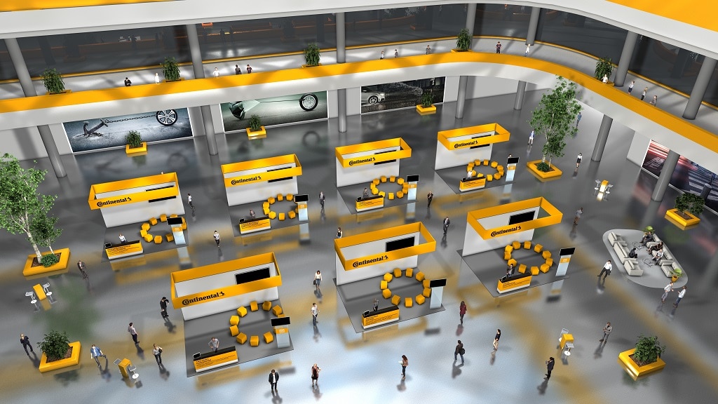 Als Dienstleistungspartner beauftragte Continental meetyoo conferencing mit der Bereitstellung und Durchführung der Konferenz. Diese bieten eine virtuelle Plattform, die individuell auf die Kundenwünsche angepasst wird und verschiedenste digitale Veranstaltungselemente verknüpft. So bestand die Global COMM Convention von Continental zunächst aus einer virtuellen Lobby, in der die Zugänge zu den unterschiedlichen Modulen zu finden waren. Darunter war unter anderem eine Messehalle mit 13 verschiedenen Messeständen, die von den jeweiligen Ländermärkten eigenständig bespielt und verwaltet wurden. An den Ständen betreuten Vertreter:innen aus den einzelnen Regionen die Kommunikation live und boten interaktive Elemente wie Gruppenchats, Skype-Konferenzen und Vorstellungsvideos an.