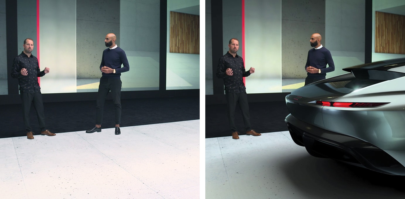 Zu diesem Zweck wurden drei Audi-Designer im Studio gefilmt, das Auto aber, dessen Features sie begeistert präsentieren, befand sich nicht im Raum. Es wurde in Echtzeit via Mixed Reality in das reale Kamerabild integriert, so dass ein ganzheitlicher Eindruck entstand. „Die Vorteile dieser innovativen Anwendung von Mixed Reality liegen auf der Hand“, so Sebastian Kuhn, Unit-Leiter Virtual Technologies bei SXCES. „Auf Basis der Original-CAD-Daten können wir den Content sehr schnell und flexibel aufbereiten und Details, z.B. in sogenannten Explosionsdarstellungen, zeigen.“