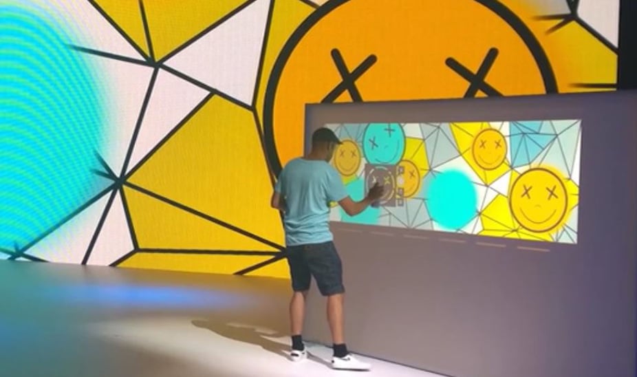 Der Graffiti Künstler Tofa nutzte einen Rückprojektions-Bildschirm und eine Infrarot-Spraydose, um vor den Augen der Zuschauer farbenfrohe urbane Szenen zu gestalten. Die Entstehung seiner Werke wurde in Echtzeit auf einem großen LED-Screen wiedergegeben.