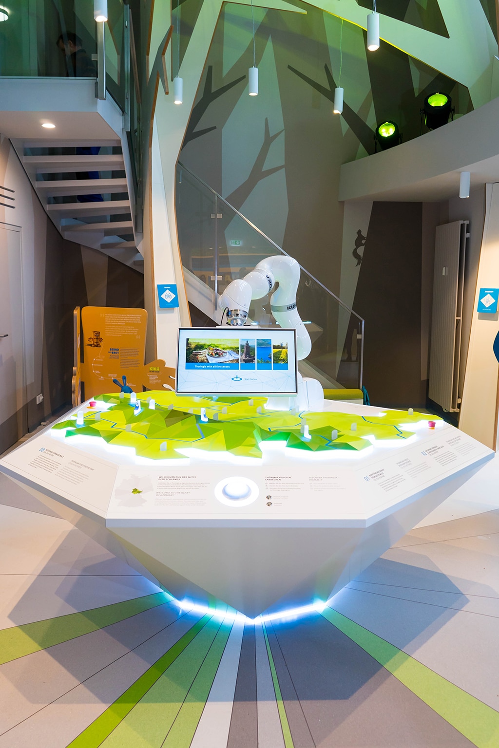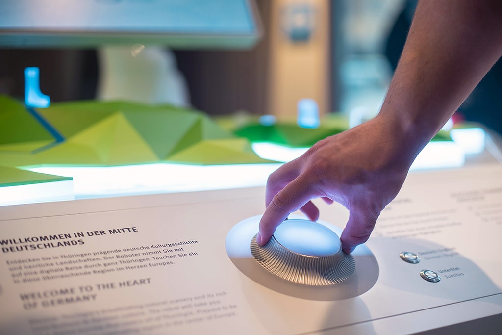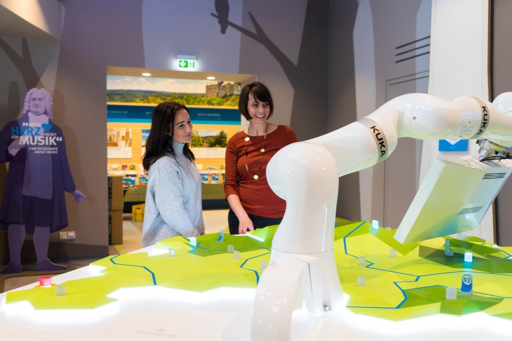 Die neue Touristinformation Thüringen beeindruckt mit Roboter und Virtual Reality. Eigentlich ist das Land ja eher für Bratwürste und Klöße bekannt … Und genau deswegen war es an der Zeit, dieses klischeehafte Bild zu korrigieren. Thüringen ist ein erfolgreicher Hightech Standort, das wollte unser Kunde zeigen – ebenso wie die Schönheit des Landes und seine kulinarischen Spezialitäten. Wir haben zum ersten Mal einen Kuka-Roboter als eine Art Guide eingesetzt, der verschiedene Touren durch Thüringen anbietet. Die Leute lieben es, ihn zu steuern und mit ihm auf Entdeckungsreise zu gehen.
