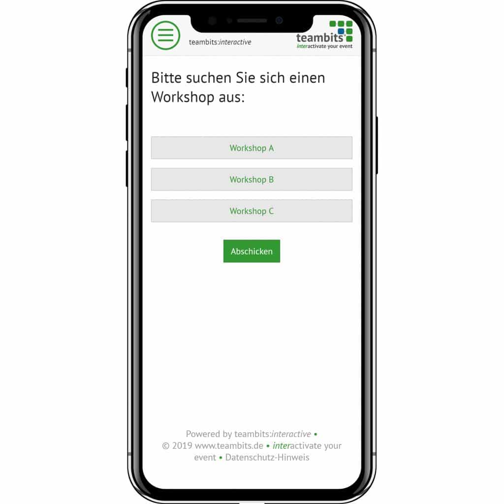 Die aktuellste Form der Teilnahme geschieht ad-hoc per „Web-App“ über eine im Browser geöffnete Adresse, die ich bequem per QR-Code, E-Mail oder SMS mitteilen kann. Die Akzeptanz einer installationspflichten App ist dagegen statistisch nachweisbar gering. Sie spielt nur dort eine Rolle, wo ich Teilnehmer zentral mit geliehenen Geräten ausstatte oder spezielle Gerätefunktionen nutzen möchte.
