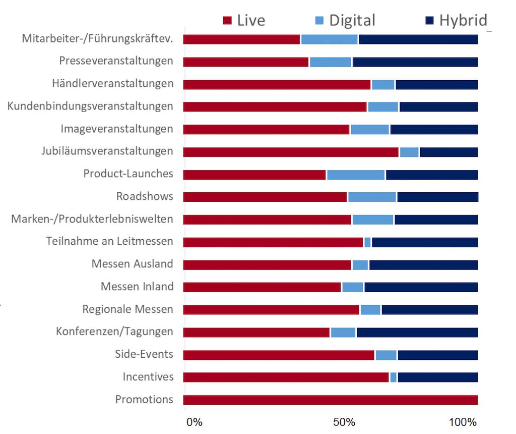 Während COVID-19 wurden digitale Formate etabliert und diese werden tendenziell für Veranstaltungen mit einem hohen Informationsgehalt wie Kongresse, Meetings u. ä bleiben bzw. live ergänzt und/oder verlängert wie durch ganzjährige Messeplattformen.