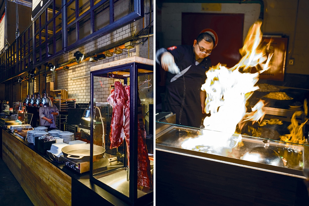 “The Butcher”. Meat & More. Front-Cooking-Station für ambitionierte Fleischliebhaber. Genuss-Meile für anspruchsvolle Gaumen. Mit Blick aufs Dry Aged Beef im Reifekühlschrank. Kirbergs Köche und Metzger haben live tranchiert, gewurstet, gebraten und gegrillt – und u.a. dies serviert: Roastbeef und Flanksteaks; karamellisierte Süßkartoffel mit Curry und Ingwer; Turkey-Steak mit grobem Pfeffer und Salbei; US-Ribeye Butcher’s Cut; Beef-Burger im Brioche Bun, rotes BBQ-Zwiebelchutney, Zitronen-Senfmayonnaise und Römersalat.